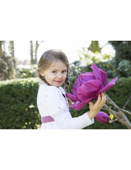 Magnolia ‘Meganolia’ to wyjątkowa odmiana o ogromnych, różowo-fioletowych kwiatach, które osiągają nawet do 30 cm średnicy. Kwitnie bardzo obficie wczesną wiosną, zanim pojawią się liście, tworząc bajkowy widok i przyciągając wzrok z daleka.