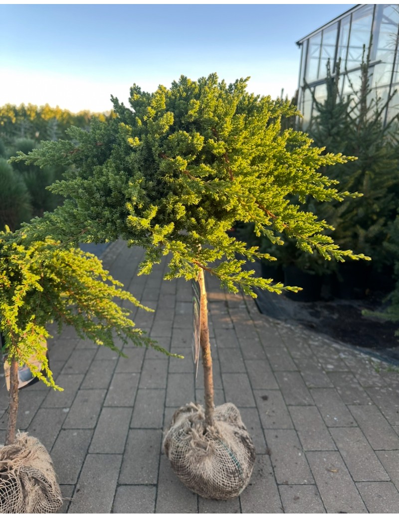 Juniperus procumbens ‘Nana’ to jedna z najpiękniejszych niskich odmian jałowca, znana ze swojego miękkiego, gęstego i lekko „kaskadowego” pokroju. W formie szczepionej na pniu 60 cm tworzy efektowną, rozłożystą koronę o barwie chłodnego, niebieskozielonego igliwia.