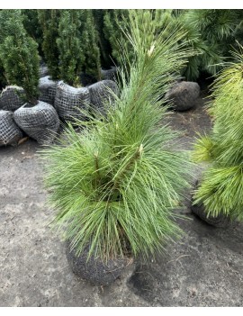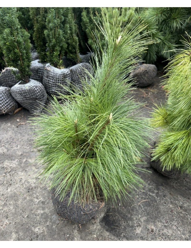 Igły są długie, miękkie i mają lekko niebieskawy odcień, co sprawia, że roślina wygląda bardzo subtelnie i wyróżnia się na tle innych sosen.